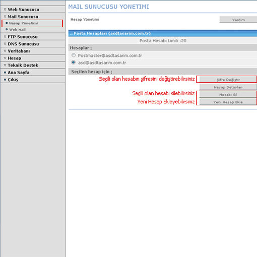 panel.alanadı.com (Örneğin:panel.asdtasarim.com.tr )adresinden size vermiş olduğumuz kullanıcı adı ve şifre ile giriş yapıp istediğiniz mail adresini açabilir silebilir ve şifrelerinizi değiştirebilirsiniz.